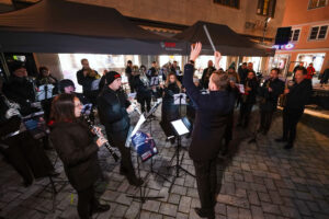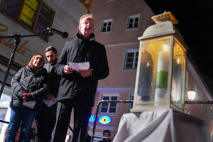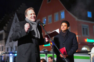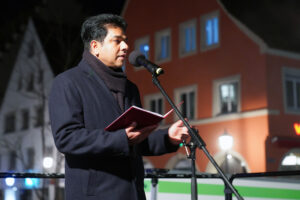 „Es ist genau der richtige Ort“ – die ganz andere Situation auf den Philippinen im Blick, machen wir uns an diesem Abend auch bewusst, dass Freiheit und Menschenwürde keine Selbstverständlichkeit sind. Sie sind, wie das in feinste Tröpfchen versprühte Wasser aus dem Freiheitsbrunnen flüchtig. Bischof Bertram Meier erinnert daran, dass es in Deutschland und Europa gerade heute wichtig ist, Menschenwürde und Menschenrechte wieder in den Mittelpunkt zu stellen. Egoismus und Gleichgültigkeit – so Bischof Meier – sind in den letzten Jahren in einem erschreckenden Ausmaß gewachsen. Als Christen können wir da nicht sprach- und tatenlos bleiben. So ist es wichtig, solche Zeichen zu setzen wie an diesem Abend in Memmingen. Und dabei nicht unter uns zu bleiben, sondern uns zusammenzutun mit allen Menschen, die diese Überzeugung teilen. Ein wenig deutlich wurde das an diesem Abend auf dem Weinmarkt. Auf der Bühne standen die Gäste von den Philippinen, Vertreter von missio, Vertreter:innen der Stadt- und Landespolitik, Vertreter des Bündnisses für Demokratie und Menschenrechte, und Menschen aus Memmingen, die das Anliegen teilten. An dem Punkt gebe ich zu, dass ich etwas enttäuscht war. Ich hätte mir gewünscht, dass mehr Menschen dem Aufruf folgen.
