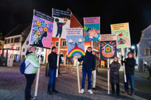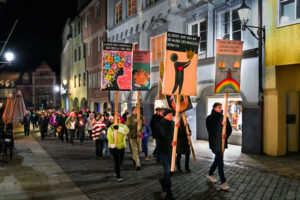 Ich lese die Standarten, auf denen Schülerinnen und Schüler der Lindenschule die Zwölf Artikel ins heute übertragen haben und mir wird bewusst, was das „ins-Heute-übertragen“ für Menschen bedeutet, die nicht in einem freien und demokratischen Land leben wie wir. Es bedeutet: Den Einsatz für die Menschenwürde und die Menschenrechte bezahle ich mit Einschüchterung, Repression, Gefängnis, ja vielleicht sogar mit meinem Leben.